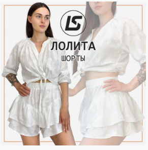 Она сделана с поясом на резинке, кокеткой спереди и сзади, выполненной углом, а также рюшкой, из-под которой выглядывают шорты, повторяя её форму.