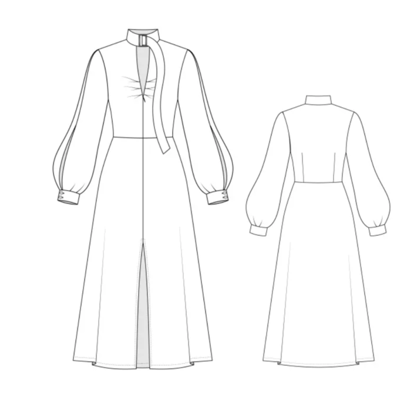 Платье прилегающего силуэта, длиной до середины голени, отрезное по талии, без подкладки. Перед с регулируемым декольте за счет молнии в среднем шве, с защипами на груди. Спинка с талиевыми вытачками. Юбка трапеция с разрезом в среднем шве переда. Молния по переду может быть потайной или двухзамковой. Воротник стойка с пряжкой или бантом на выбор. Рукав втачной, длинный, двухшовный, с разрезом по верхнему шву и манжетой на пуговицах. В комплекте лекал (отдельным файлом) есть второй рукав — втачной одношовный с локтевой вытачкой, для самостоятельного моделирования.