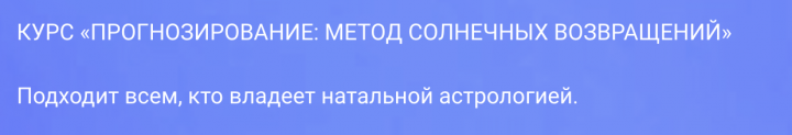 Пройдя этот курс, Вы сможете научиться интерпретировать карты солнечных возвращений и выбирать места для встречи соляра.
