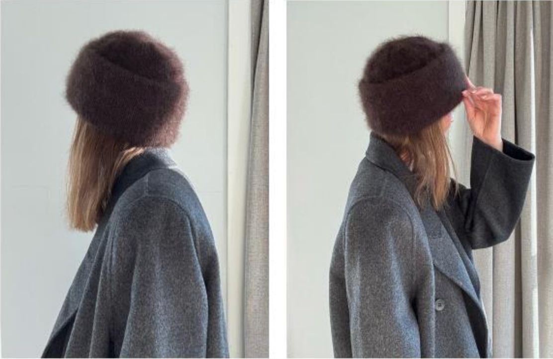 BRUSHED LOOP HAT это пушистая шапка с широким сложенным отворотом и спиральными убавками, с помощью которых сформирована макушка шапки. Шапка вяжется снизу вверх. Петли набираются открытым набором, и шапка вяжется по кругу. Потом провязанный участок складывается и петли провязываются вместе с открытыми наборными петлями, образуя двойной край. Затем шапка вяжется по кругу с убавками для формирования макушки. Наконец, шапка начесывается для пушистости и объема.