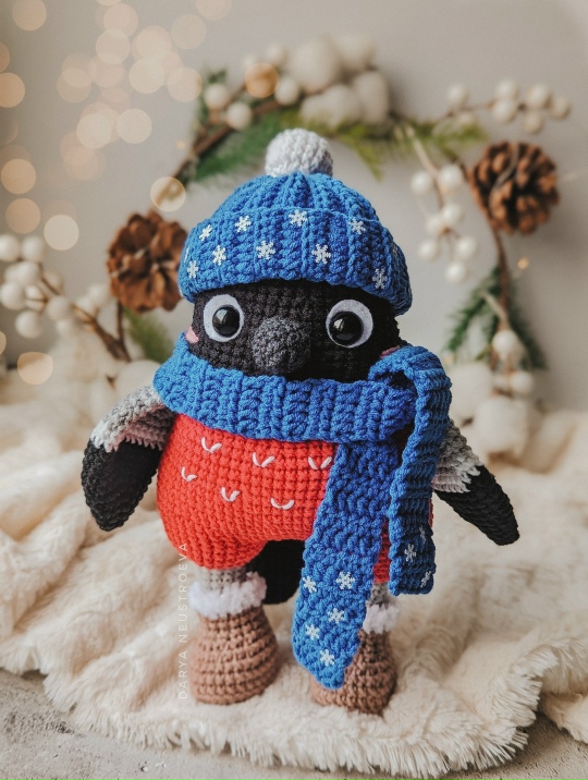 МК в формате PDF. Текст + фото. Размер игрушки около 21 см. Шапка и шарф снимаются. Пришивается только клюв. МК содержит описание поэтапного вязания игрушки и фото деталей игрушки. МК не содержит уроков по вязанию крючком, предполагается наличие основных навыков вязания.