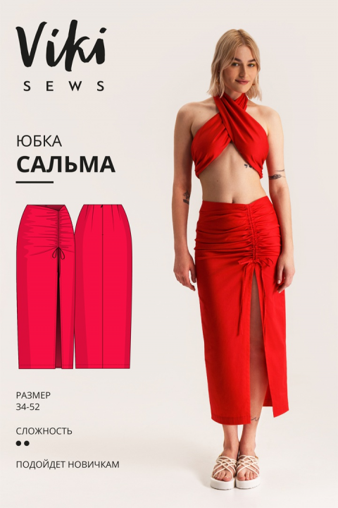 Выкройка юбки малого объема, прямого силуэта. На переднем полотнище с левой стороны сборка на кулиску с длинными завязками, формирующими драпировку, и высоким разрезом. Застежка в среднем шве заднего полотнища на потайную молнию.