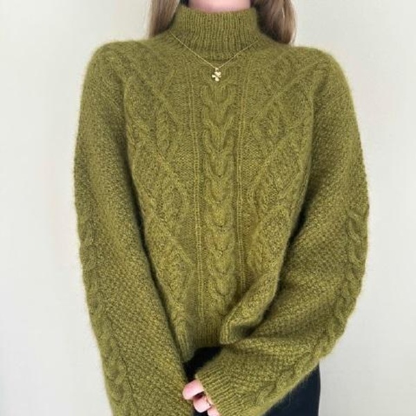 У пуловера очень удачная длина, при хорошем припуске на свободу облегания он не смотрится "квадратным" за счет продольных дорожек кос.